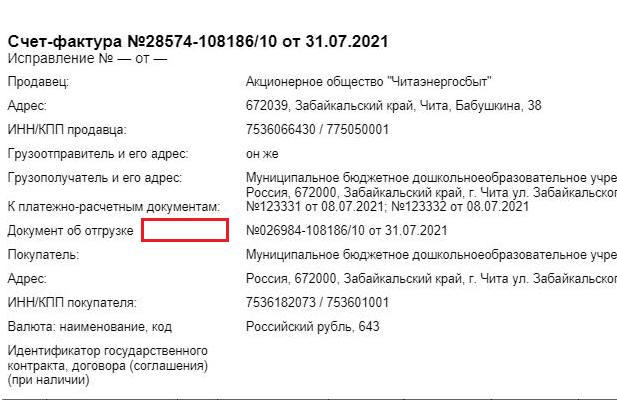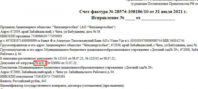 АО «Читаэнергосбыт» за один месяц формирует одну товарную накладную (один акт приема/передачи ээ), поэтому в строке 5а – будут отображены все номера по порядку из счет-фактуры, например «(№ п/п 1-6») и реквизиты (номер, дата) товарной накладной текущего периода.